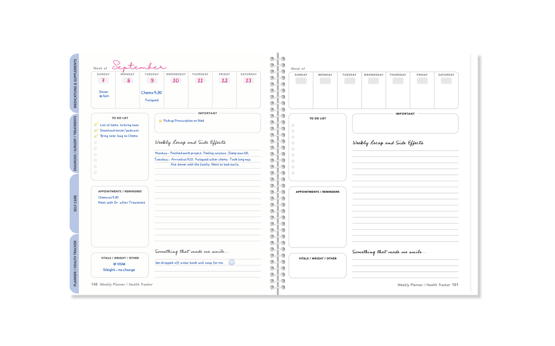 - 26-week undated planner to record Dr. appointments, track treatments, side effects and more.