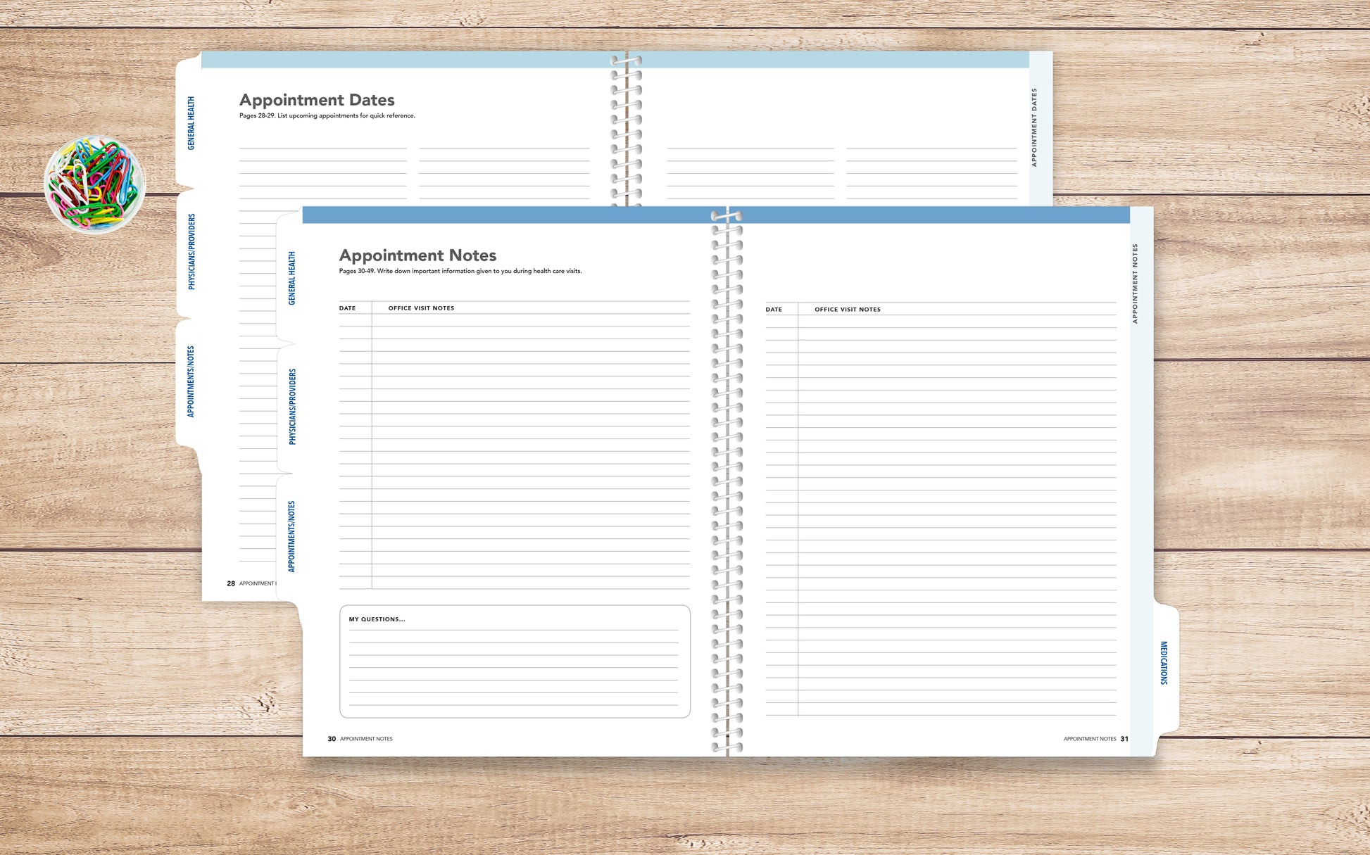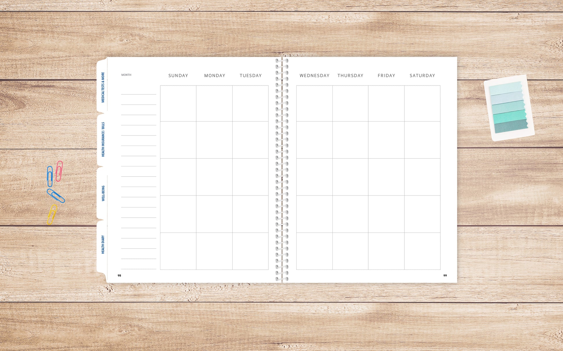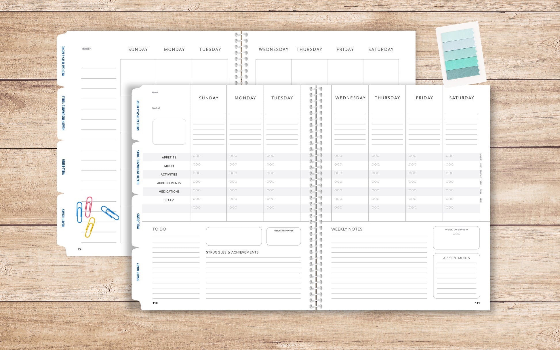 Six month undated weekly planner to track appointments, health, mood, and sleep.